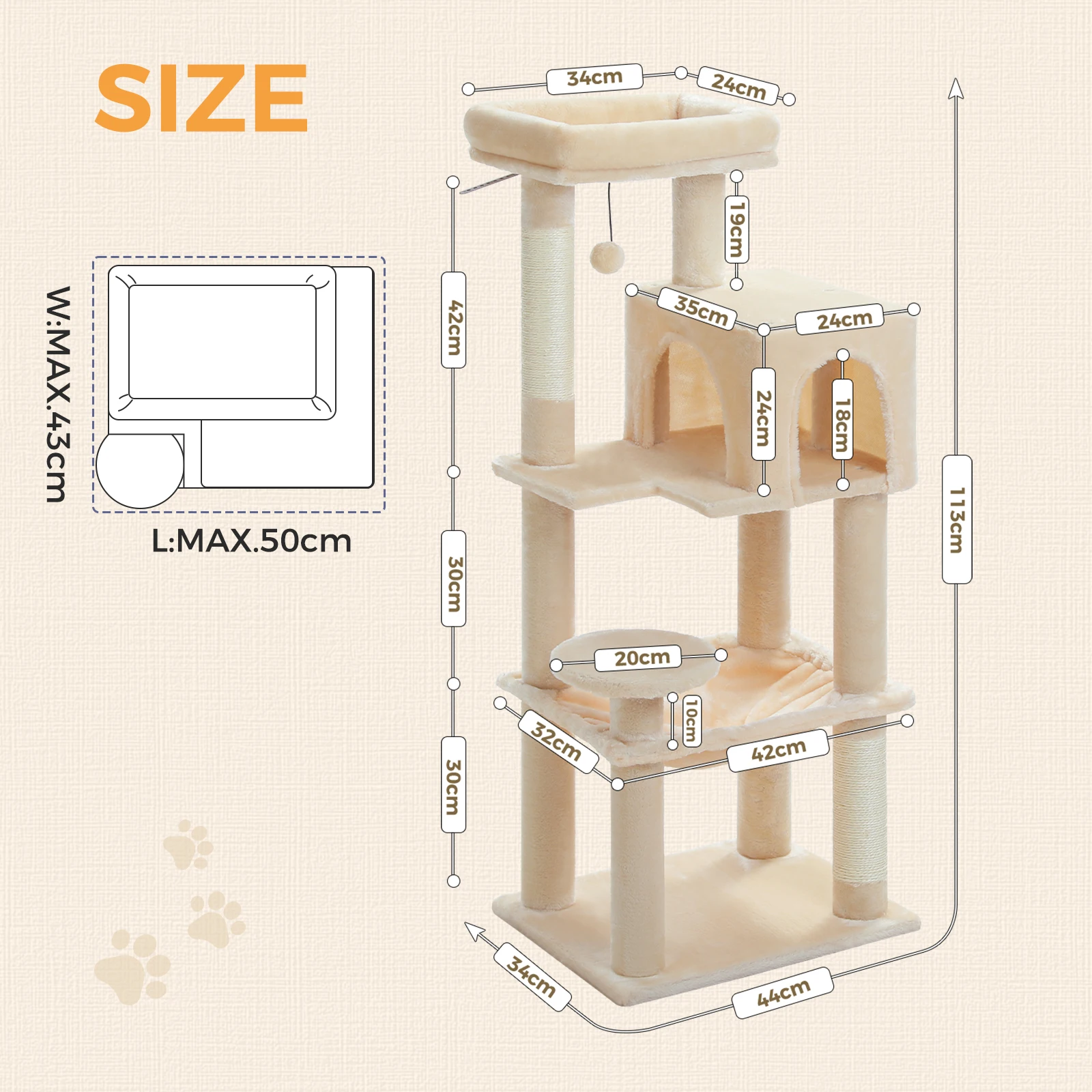 Give your cat the ultimate playground with our 5-Level Cat Tree Tower. Standing at 113 cm, this multi-level design offers everything cats love — from a cozy condo and soft hammock to sisal-covered scratching posts and a top perch for the best view in the house.